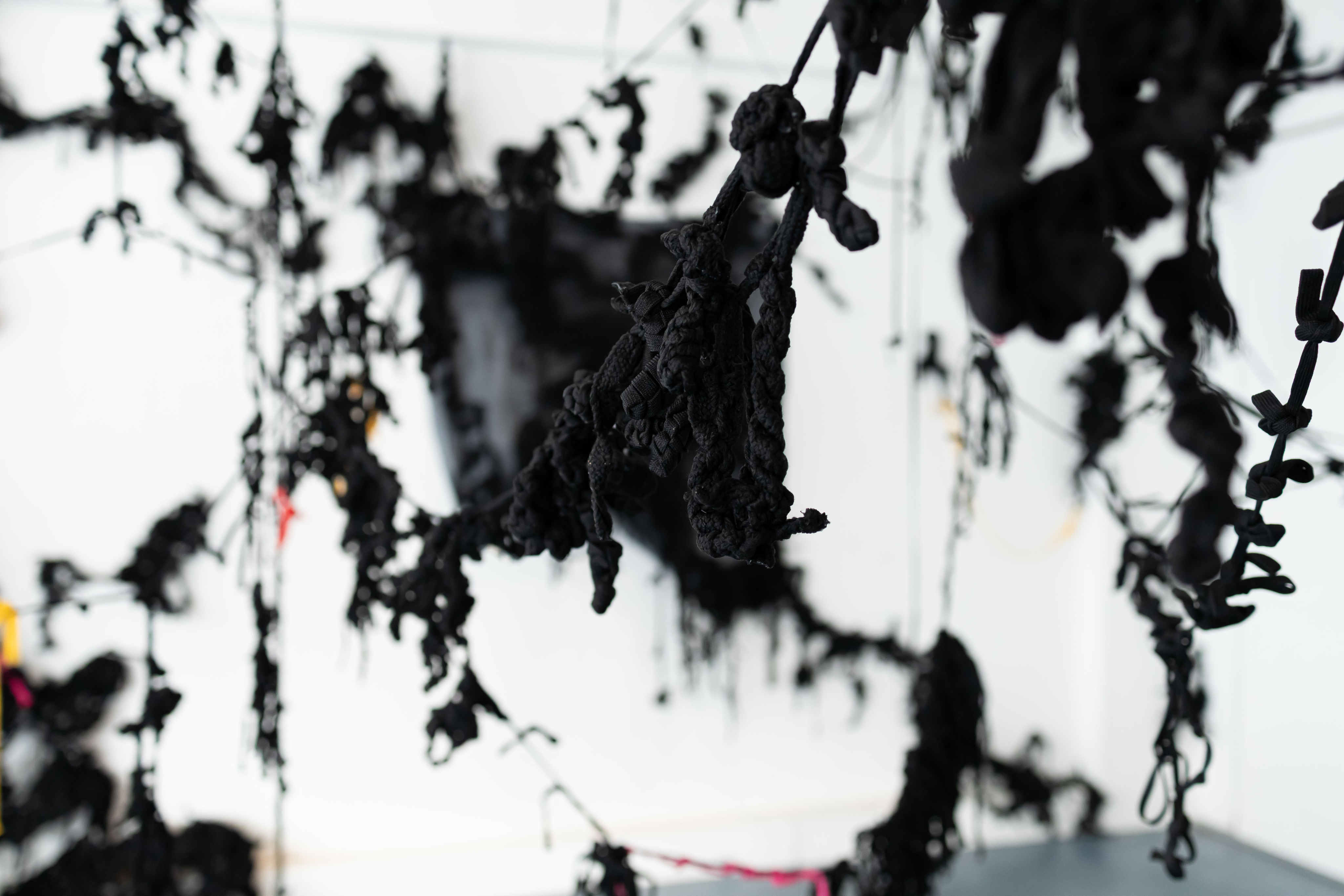 The use of shoelaces came from a personal experience of De Lacy and she uses it as a way to start the conversations. The installation acts both as a collection of traumatic stories and a way for people to add more to it. Viewers can create their own knots and add it to the ever growing and changing enviroment of the Knotted Entity project.